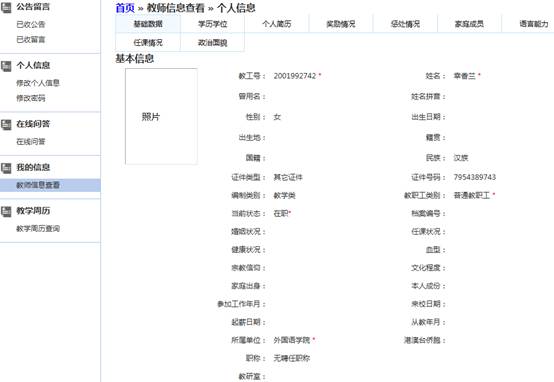 【我的信息】|【教师信息查看】查看教师个人信息,点击对应的选项卡查看学历学位,个人简历,奖励情况,惩处情况等,如图1-9
