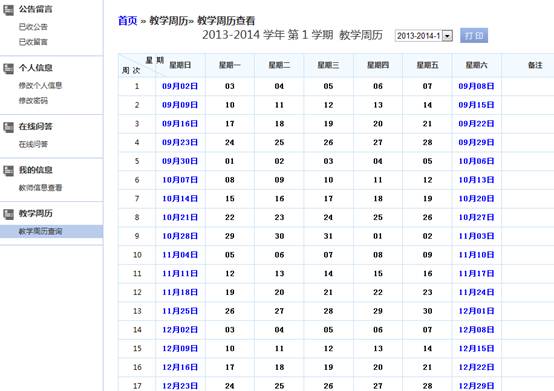 【教学周历】|【教学周历查询】查询打印学期日历,如图1-10