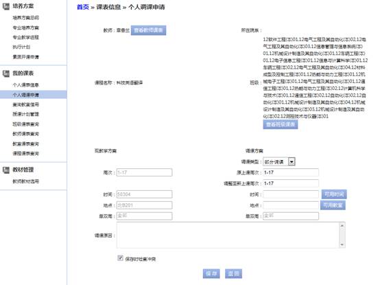 【课表信息】|【个人调课申请】申请调课,如图2-9