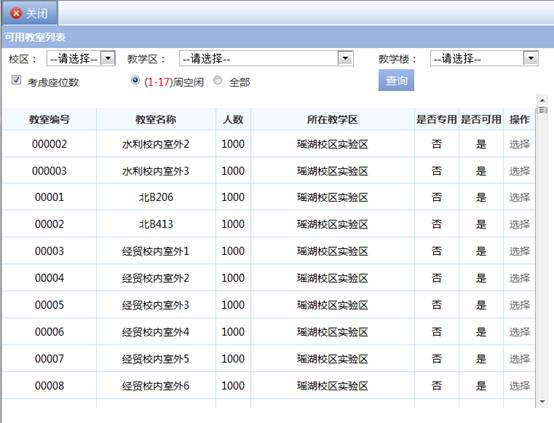 步骤三. 点击【可用教室】按钮弹出教室选择页面,点击【选择】按钮选择。如图2-12
