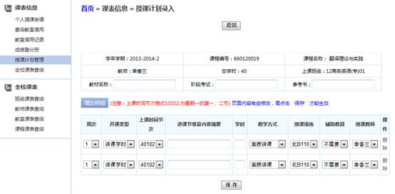 步骤三. 点击【增加明细】按钮在下方新增一栏,选择开课类型,上课时间节次,讲课章节及内容摘要等,反复步骤三录入完课程所有授课计划点击【保存】按钮保存。
