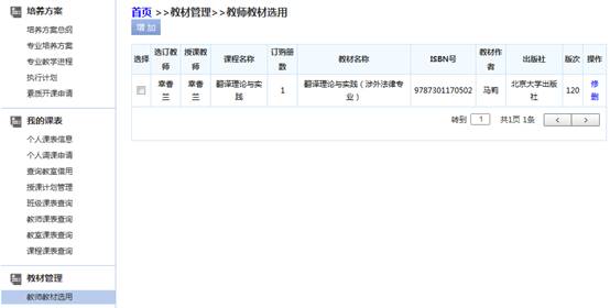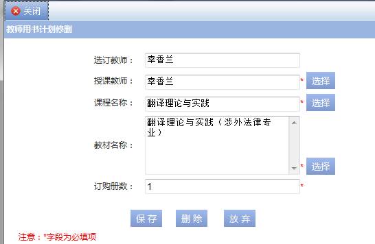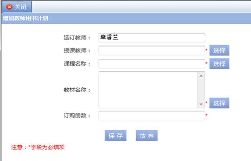 步骤一. 点击【增加】按钮弹出增加页面,选择授课教师,课程,教材,输入订购册数,点击【保存】按钮保存,如图2-24