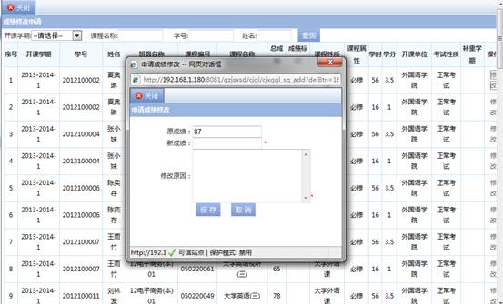 步骤三. 点击【修改】按钮弹出修改页面,输入新成绩及修改原因点击【保存】按钮,如图3-12