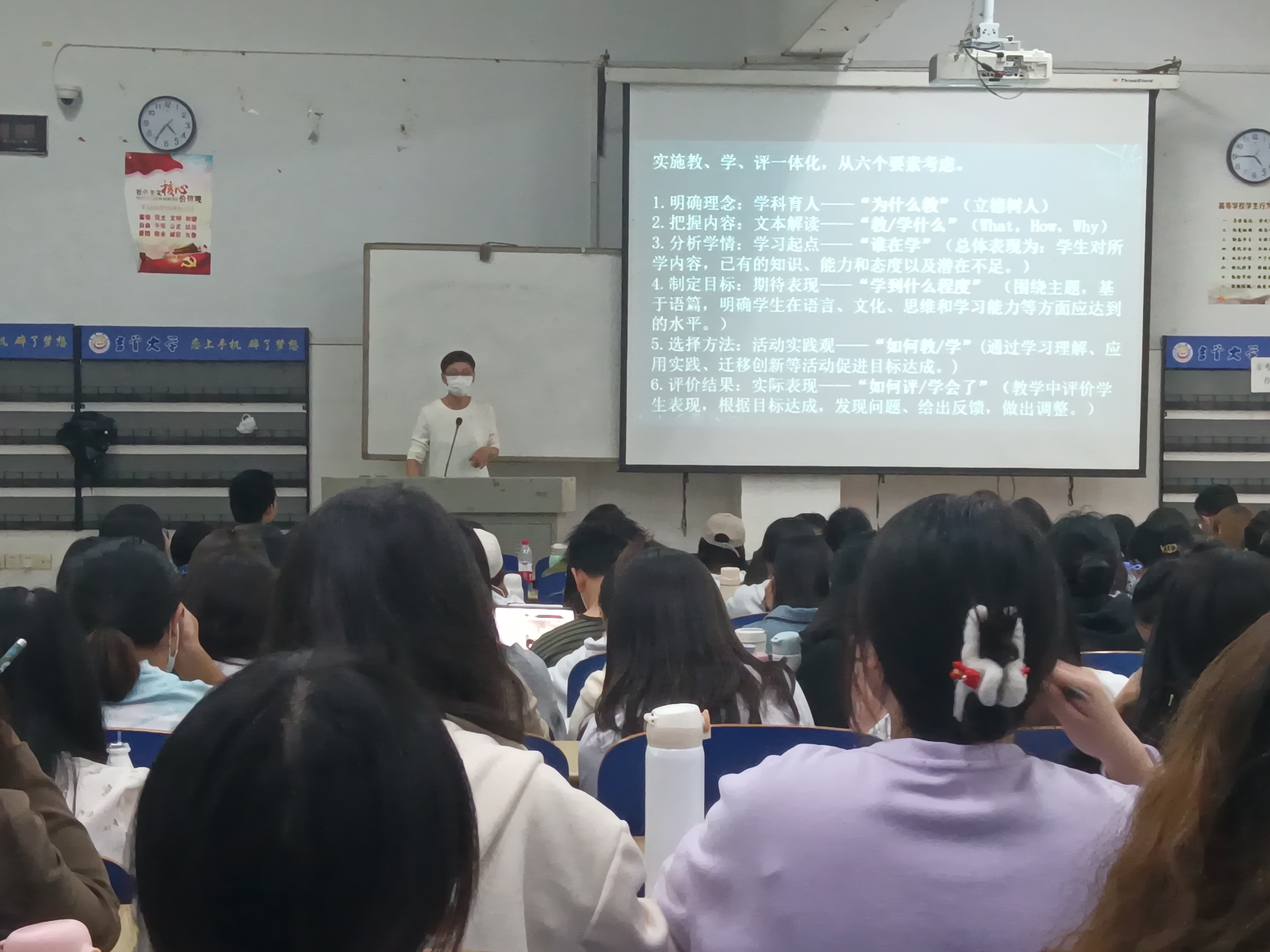 本网讯(修伟)10月24日下午,外国语学院名师流动站双师协同课堂系列教学研讨课活动在张家界校区逸夫楼如期举行,我校中小学外语名师流动站首批入站专家、张家界市教科院特级教师伍杰为2020级英语(师范)专业学生讲授《“教、学、评”一体化实施:以一节高中英语课为例》,并与学院教师开展专题研讨。学院副院长简功友、2019级英语教育实习队指导教师、学院外语教师教育课程团队、英语语言核心技能教学团队教师,及2019级、2020级英语师范生通过线上、线下两种方式参与了相关活动,活动由简功友主持。