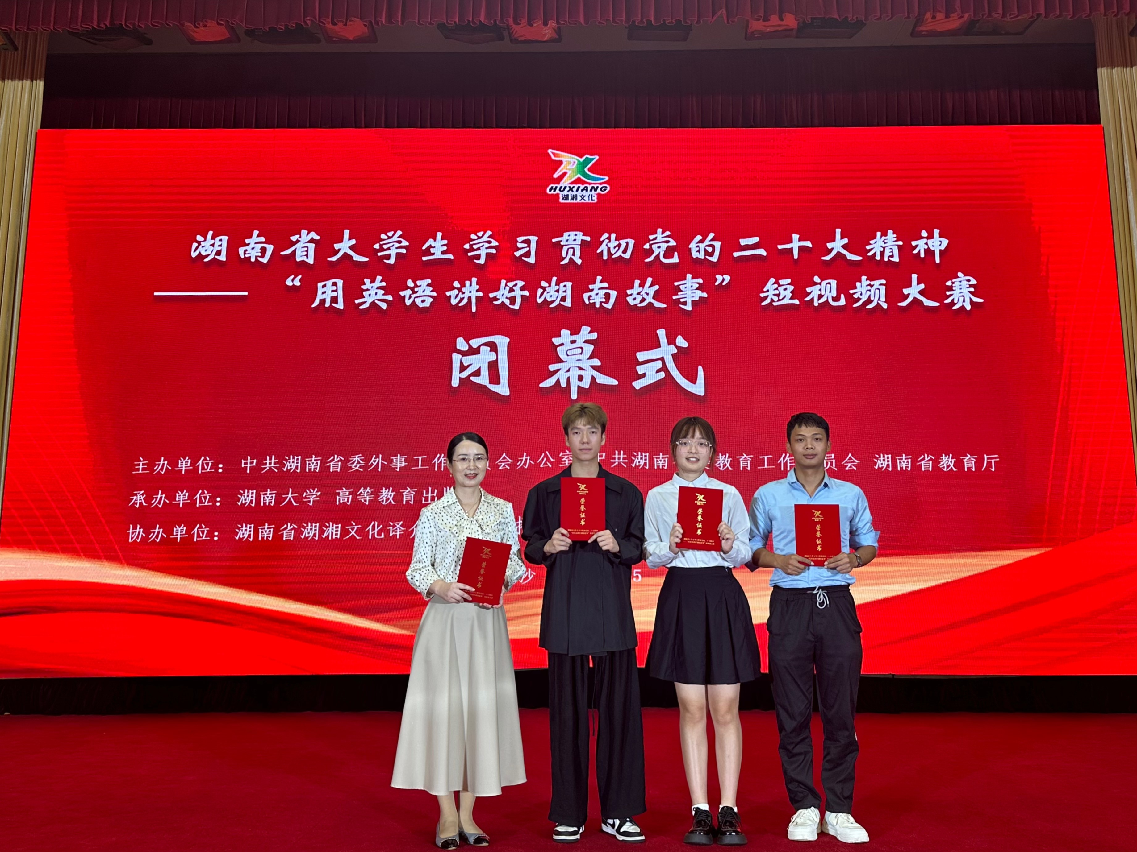 (通讯员 陈凯鹏 宋外飞)9月15日上午,由中共湖南省委外事工作委员会办公室、中共湖南省委教育工作委员会、湖南省教育厅主办,湖南大学、高等教育出版社承办的湖南省大学生学习贯彻党的二十大精神——“用英语讲好湖南故事”短视频大赛闭幕式暨颁奖典礼于长沙市举行。中共湖南省委外办副主任邱爱华、高等教育出版社总编辑谭方正致辞,湖南省教育厅一级巡视员罗桂香宣布获奖名单。本次大赛分本科组和高职高专组,全省高校踊跃参赛,最终全省116所高校共提交297件参赛作品,其中普通本科173件,高职高专124件。经过评审专家组的认真评审,本科组一等奖14件、二等奖21件、三等奖35件;高职高专组一等奖10件、二等奖15件、三等奖25件,12所高校荣获优秀组织奖。william威廉英国官网选送的四件参赛作品全部获奖。外国语学院石琳副院长率一二等奖团队代表参加了此次颁奖典礼。