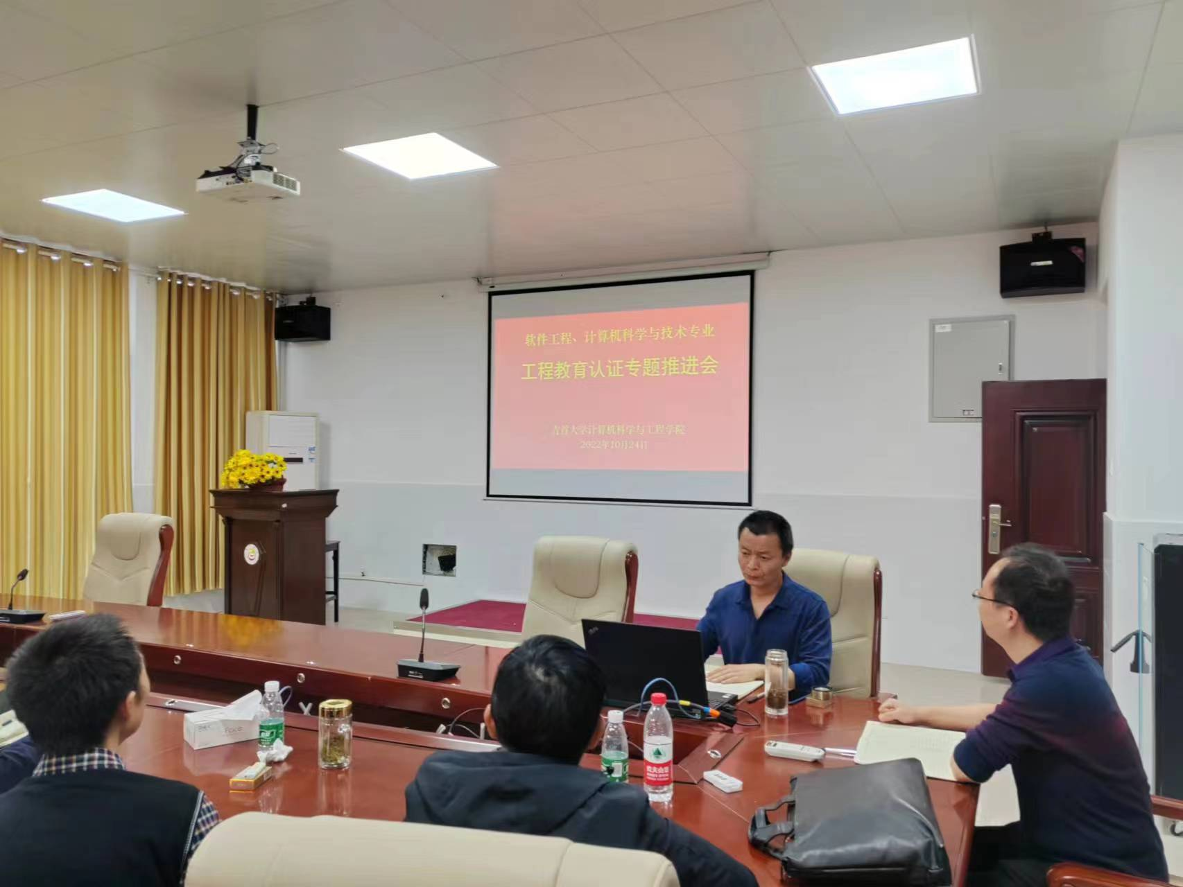 本网讯(通讯员向珍)10月24日,计算机科学与工程学院在张家界校区会议室召开工程教育专业认证工作推进会。学院院长廖柏林教授主持会议,学院党委书记李爱华、副书记李景军、副院长徐洪智、副院长李宗寿、副院长覃遵跃、院长助理蔡国民,以及各系部主任和部分骨干教师参会。